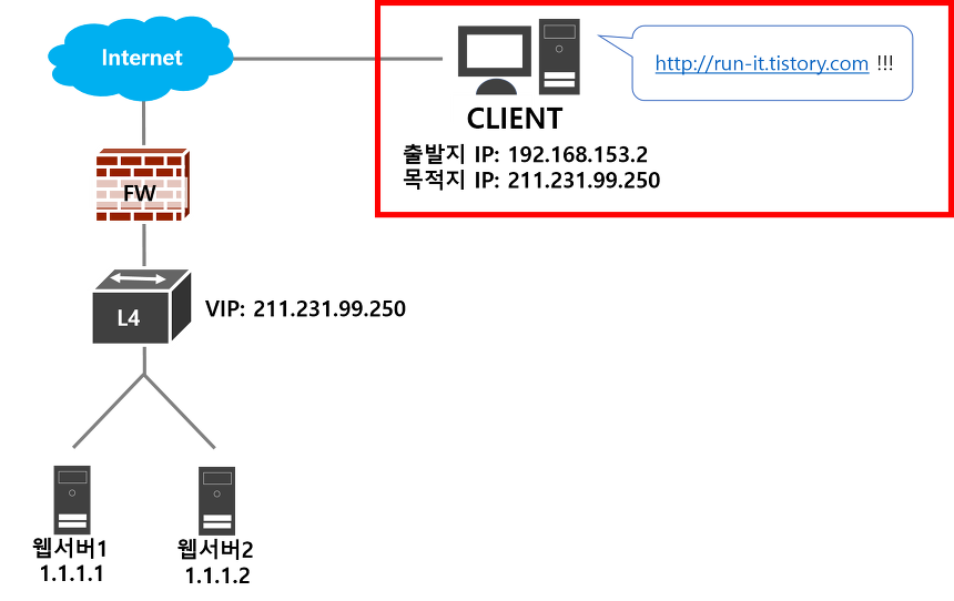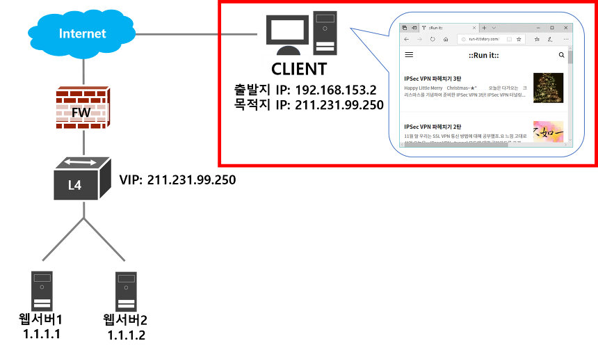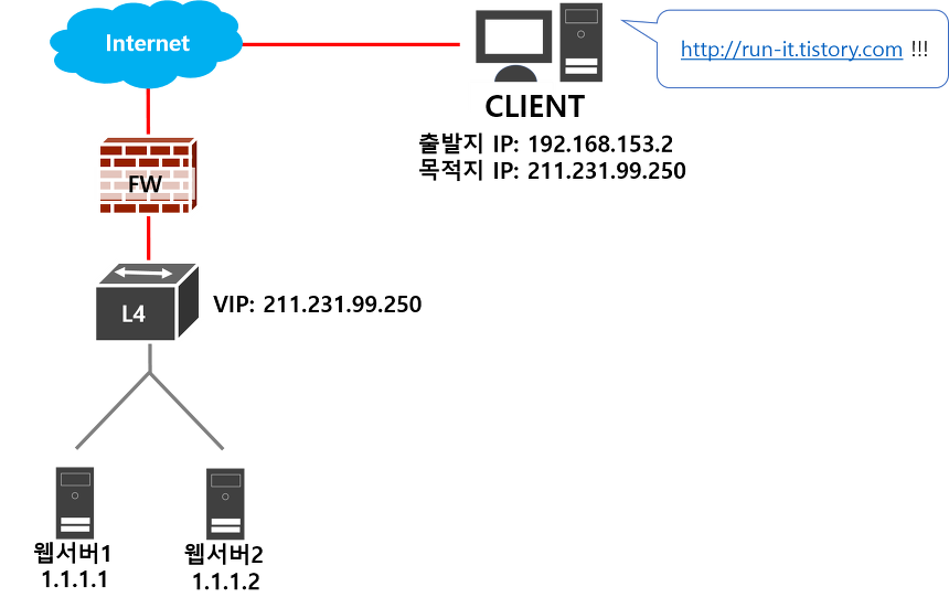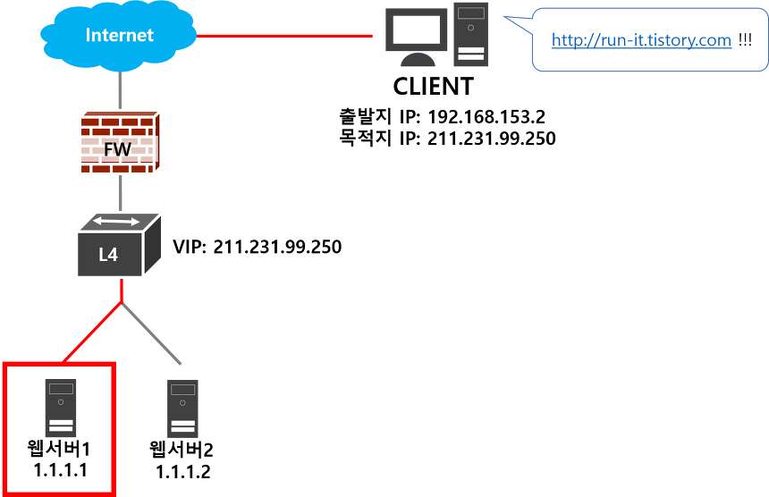 따라서 L4에서 VIP를 설정하여 VIP를 보고 들어오는 패킷을 자연스럽게 등록되어 있는 웹서버로 부하분산 해줍니다.