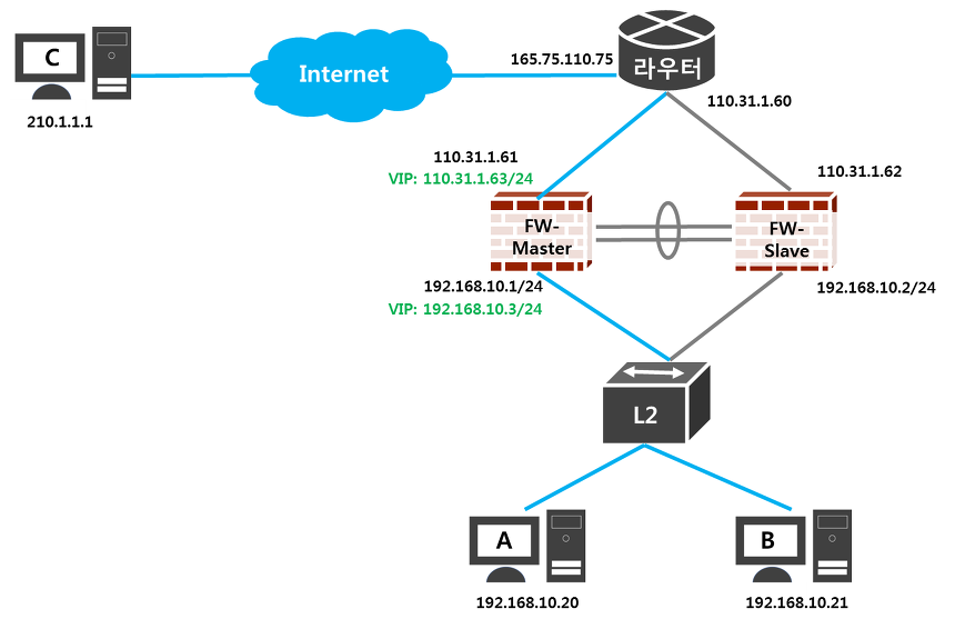 이러한 경우를 대비하여 VIP를 할당해 FW중 Master 장비에서 VIP를 가져가도록 설정합니다.
