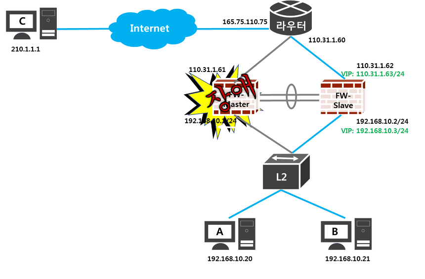 만약! 아래와 같이 방화벽 Master 장비가 장애가 났다면!! VIP는 어떻게 되는 거지!?!?