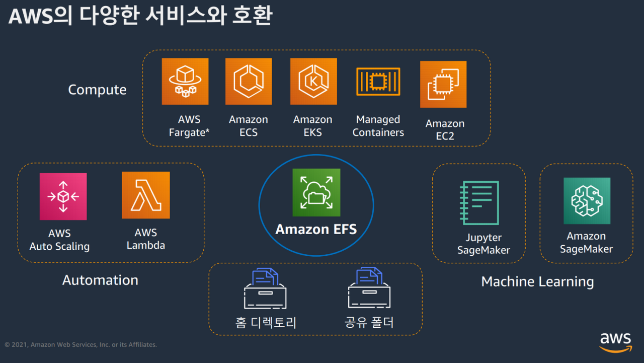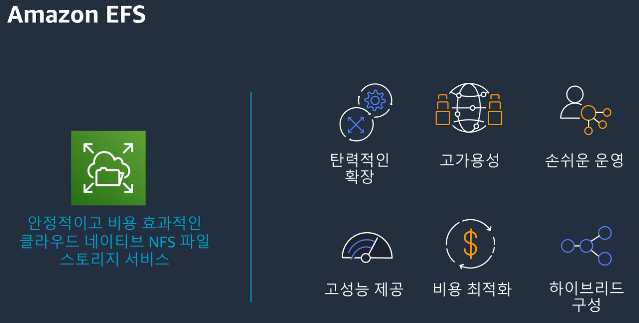 - AWS 클라웃드 서비스와 온프레미스 리소스에서 사용할 수 있는 간단하고 확장 가능하며 탄력적인 완전 관리형 탄력적 NFS 파일 시스템