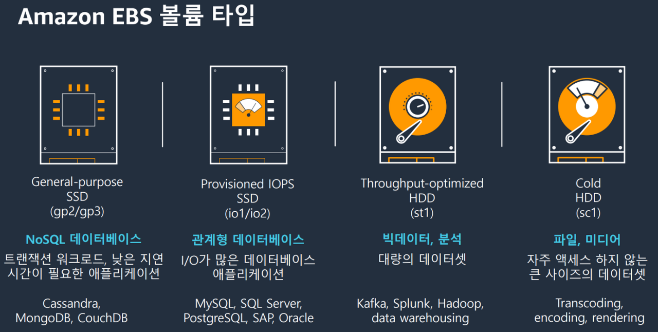| 사용 케이스 | 웹 서비스 및 컨텐츠 관리 엔터프라이즈 어플리케이션 홈 디렉토리 데이터베이스 백업 개발자 도구 컨테이너 스토리지 빅데이터 분석 | 웹 서비스 및 컨텐츠 관리 미디어 및 엔터테인먼트 백업 빅데이터분석 데이터 레이크 | 부팅 볼륨 트랜잭션 및 NoSQL 데이터베이스 데이터 웨어하우징 및 ETL |