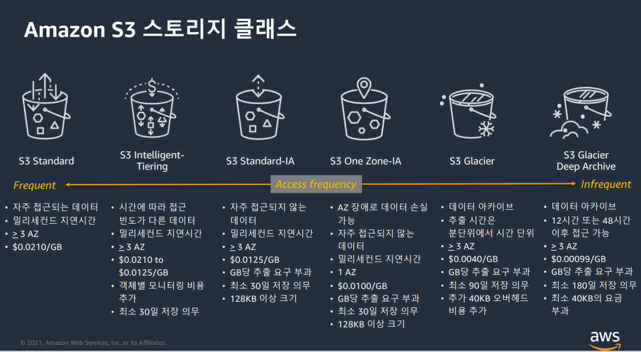| 특성 | 가용성 / 내구성 (availability, durability) | 여러 AZ에 중복 저장 | 여러 AZ에 중복 저장 | 단일 AZ에 중복 저장 |