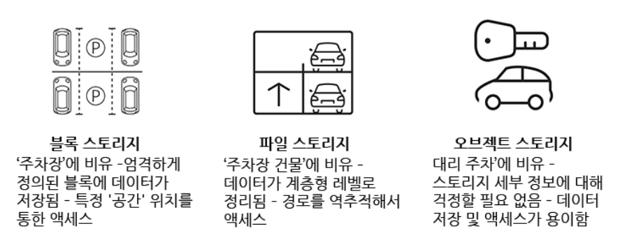 - 블록스토리지와 파일스토리지가 모두 OS 단에서 동작하지만, 오브젝트 스토리지는 어플리케이션 단에서 동작