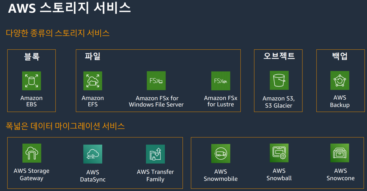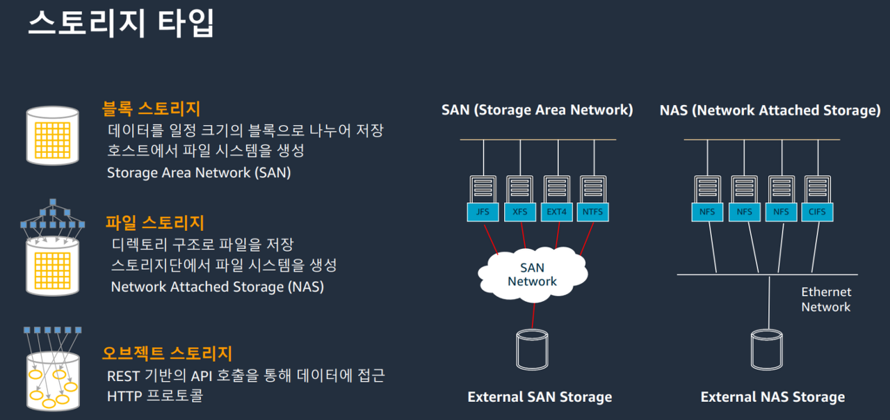 | 엑세스 | 1개~수천개의 EC2인스턴스 / on-premise 서버 / 여러 AZ에서 동시 접근 | 웹을 통한 수백만 개의 연결 | 하나의 AZ에 속한 하나의 EC2 인스턴스 | |