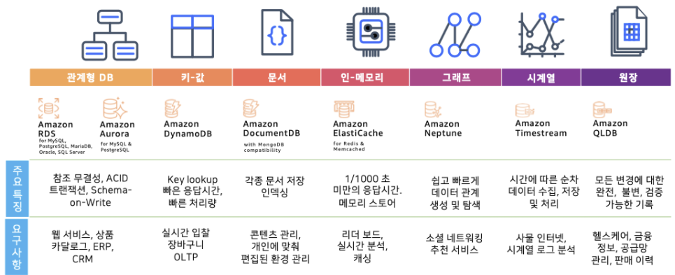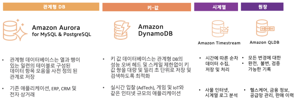 - Amazon RDS는 현재 MySQL, Oracle, SQL Server, PostgreSQL, MariaDB, Aurora(MySQL과 호환)을 비롯한 총 6가지 데이터베이스 엔진을 지원