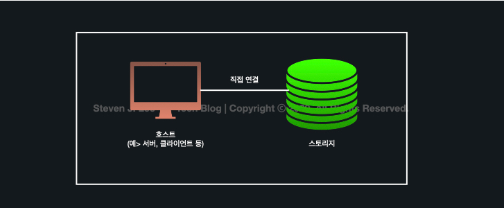저장 장치가 직접 개별 호스트(PC)에 연결되어 사용 및 관리되는 방식이다. 해당 호스트의 환경에서 저장 공간이 부족해질 경우 새로운 저장 공간을 가장 쉽게 확보할 수 있는 방법입니다.