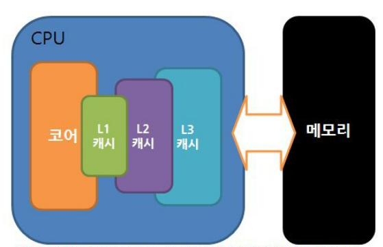 캐시 : CPU와 메인 메로리 사이에 캐시 메모리라는 빠른 속도의 메모리