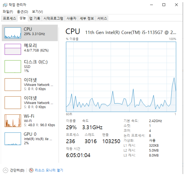 이용률: 현재 CPU가 부하를 받고 있는 백분율을 표시하며 높을수록 과부하되는 것이므로 100%되는 것을 가급적 피해야 합니다.