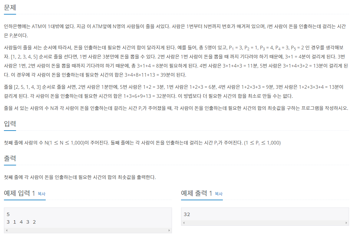 Arrays.sort(time); //적게 걸리는 사람부터 줄 서는게 최소 인출시간을 구하는 방법이다