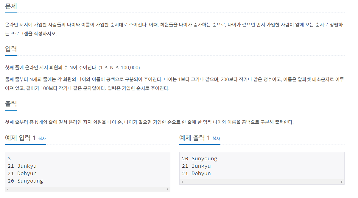 3. 나이가 같으면 가입한 순으로 정렬하라는데 이 과정은 필요없다 추가적인 정렬과정을 안가쳐도 자연스럽게 입력한 데이터 순서대로 데이터가 저장이 되기 때문이다