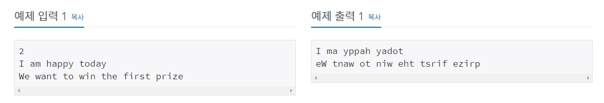 첫째 줄에 테스트 케이스의 개수 T가 주어진다. 각 테스트 케이스는 한 줄로 이루어져 있으며, 문장이 하나 주어진다. 단어의 길이는 최대 20, 문장의 길이는 최대 1000이다. 단어와 단어 사이에는 공백이 하나 있다.