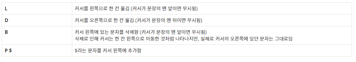 이 편집기에는 '커서'라는 것이 있는데, 커서는 문장의 맨 앞(첫 번째 문자의 왼쪽), 문장의 맨 뒤(마지막 문자의 오른쪽), 또는 문장 중간 임의의 곳(모든 연속된 두 문자 사이)에 위치할 수 있다. 즉 길이가 L인 문자열이 현재 편집기에 입력되어 있으면, 커서가 위치할 수 있는 곳은 L+1가지 경우가 있다.