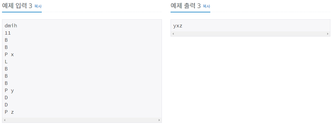초기에 편집기에 입력되어 있는 문자열이 주어지고, 그 이후 입력한 명령어가 차례로 주어졌을 때, 모든 명령어를 수행하고 난 후 편집기에 입력되어 있는 문자열을 구하는 프로그램을 작성하시오. 단, 명령어가 수행되기 전에 커서는 문장의 맨 뒤에 위치하고 있다고 한다.