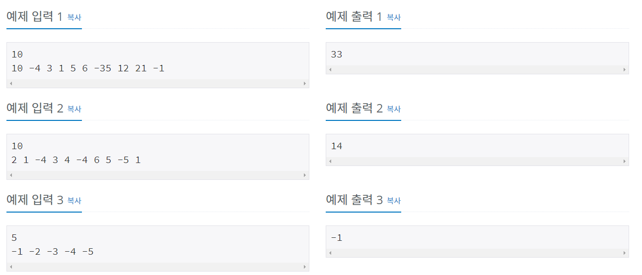 예를 들어서 10, -4, 3, 1, 5, 6, -35, 12, 21, -1 이라는 수열이 주어졌다고 하자. 여기서 정답은 12+21인 33이 정답이 된다.