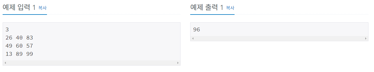 첫째 줄에 집의 수 N(2 ≤ N ≤ 1,000)이 주어진다. 둘째 줄부터 N개의 줄에는 각 집을 빨강, 초록, 파랑으로 칠하는 비용이 1번 집부터 한 줄에 하나씩 주어진다. 집을 칠하는 비용은 1,000보다 작거나 같은 자연수이다.