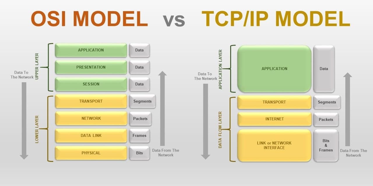 OSI 모델(Open Systems Interconnection Model)은 국제 표준화 기구(International Organization for Standardization, IOS)에서 만든 컴퓨터의 통신 기능을 계층 구조로 나눈 모델입니다. 이를 이용하면 특정 네트워킹 시스템에서 일어나는 일을 계층을 활용해 시각적으로 이해할 수 있습니다. 총 7계층으로 이루어져 있습니다. 데이터가 네트워크로 나갈 때는 위층에서부터, 네트워크에서 데이터를 받을 때는 아래층에서부터 들어옵니다. 그림에서 오른쪽은 인터넷에서 사용하는 TCP/IP 계층 모델입니다.