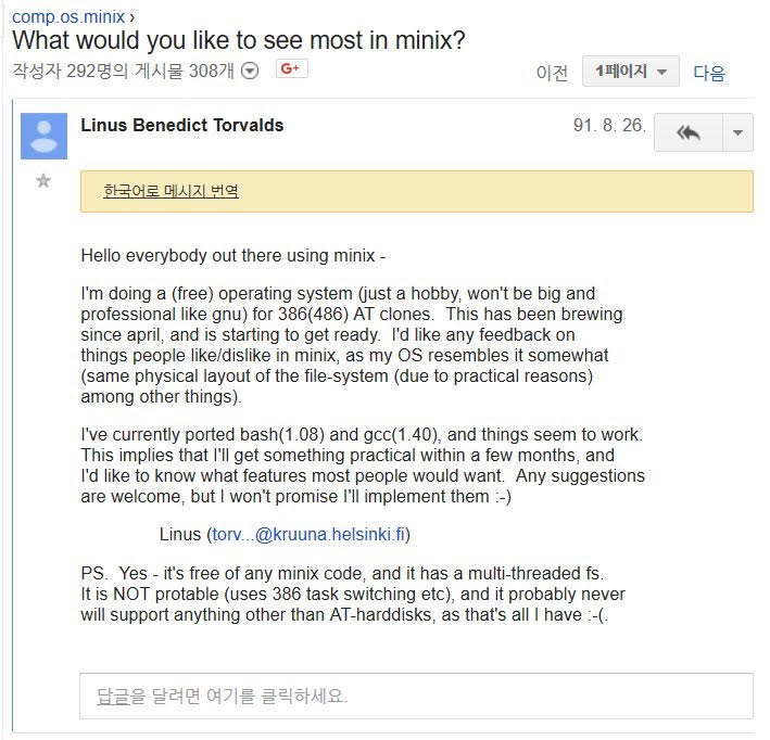 리눅스는 오픈소스로 여러 기업이나 개인의 참여로 만들어지고 있습니다. 컴퓨터 역사상 가장 많은 인력이 들어간 오픈 소스 프로젝트라고 합니다. 아래 그림은 Linux Torvalds 가 구글 그룹스에 처음으로 리눅스를 소개하는 글입니다.