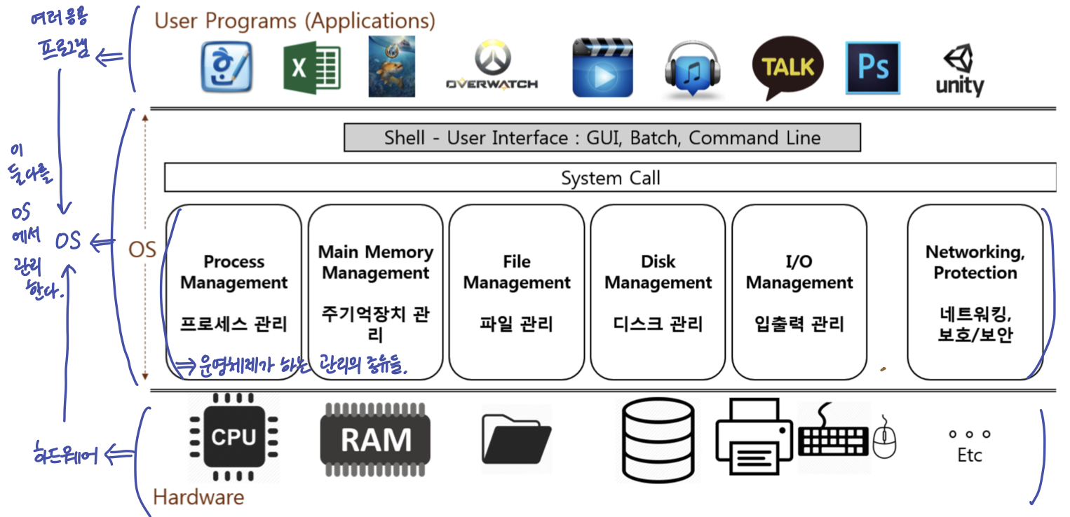 - I/O Devices(입출력장치): Monitor, Mouse, Keyboard, Network => 스스로 표시, 작동 될 수 없다. 이를 해주는 것이 OS이다.